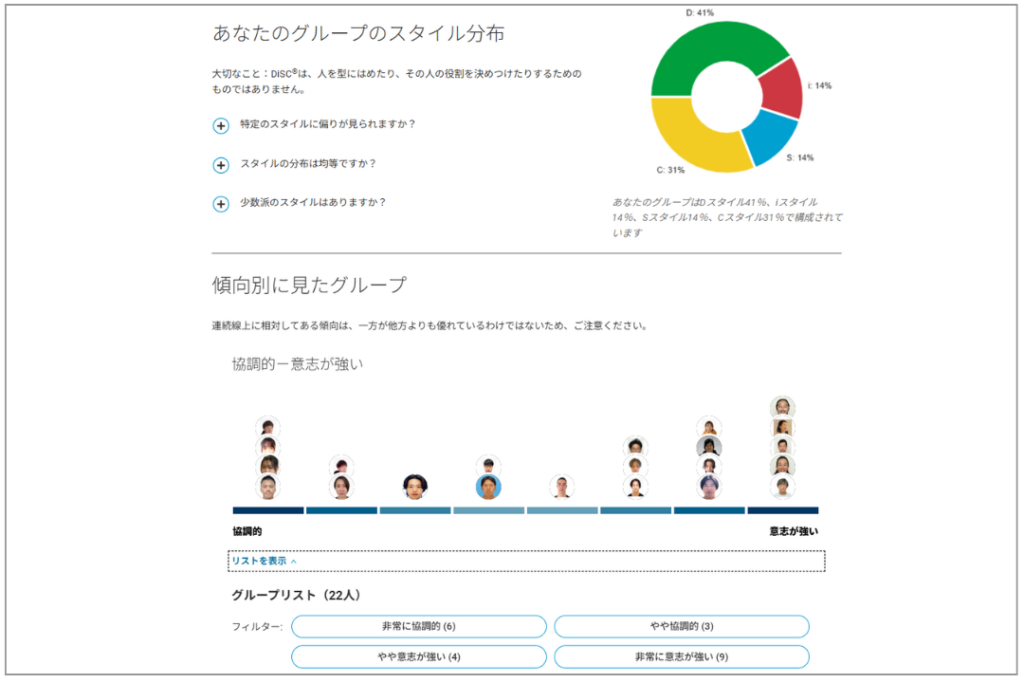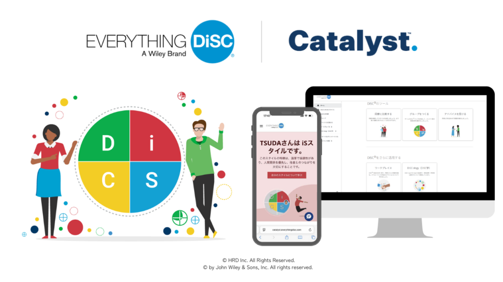 カタリストは、自分と相手の“スタイル”を可視化し、互いの違いを理解しながらコミュニケーションを取ることができるDiSC®の機能が集約した新しいオンラインプラットフォームです。スマートフォンやPCからログインできるオンラインダッシュボードでは、自分自身のスタイルだけでなく、他のメンバーのスタイルも一覧で表示され、比較や理解を助ける設計になっています。紙のレポートを読むだけでは得られにくい、継続的な理解と対話のきっかけをリアルタイムで提供できるのが特徴です。