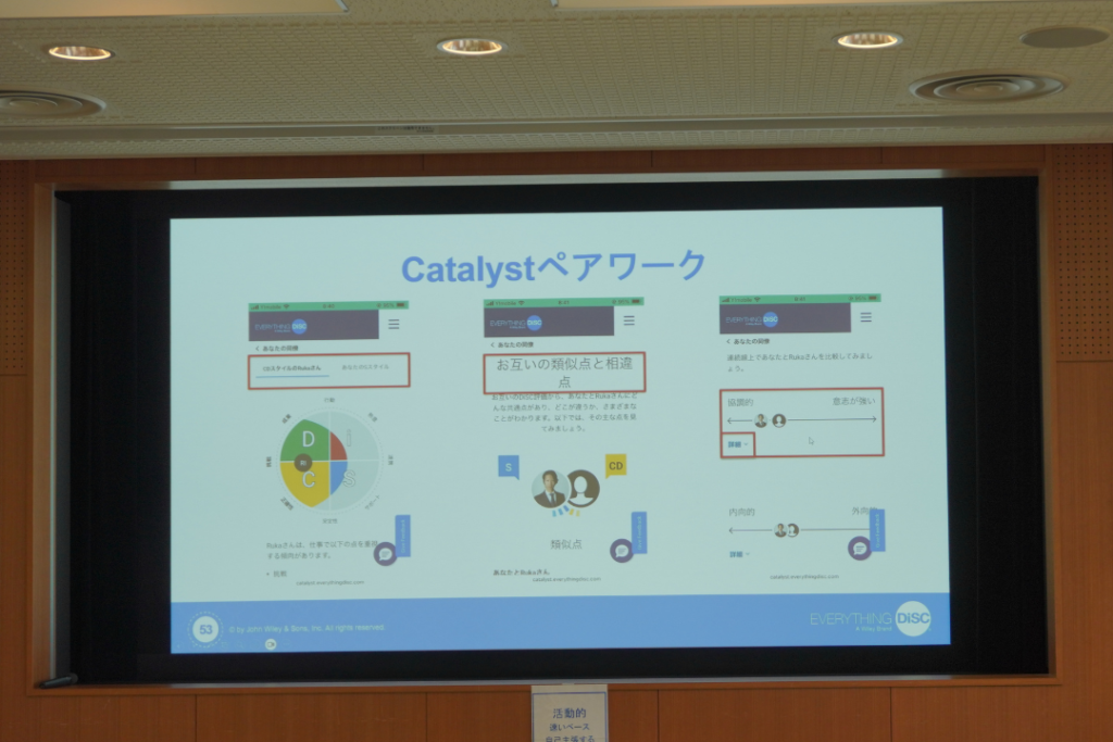 当日の研修では、参加者それぞれが自身のスマートフォンでカタリストにログインし、自分と相手のスタイルを確認しながら対話するワークを実施しました。スタイルの違いを視覚的に把握しながら話すことで、言葉だけでは伝わりにくかった「価値観の違い」「受け止め方の違い」などが、構造的に理解できるようになっていきました。