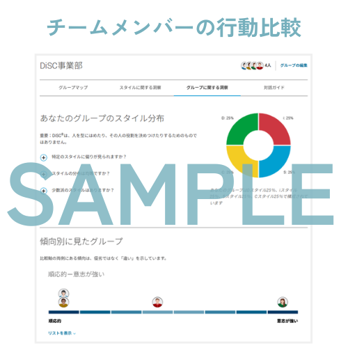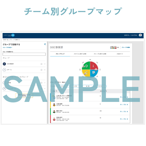 同じ組織に所属するチームメンバーやプロジェクトメンバーのスタイルを、ひとつのDiSC®マップ上に表示できます