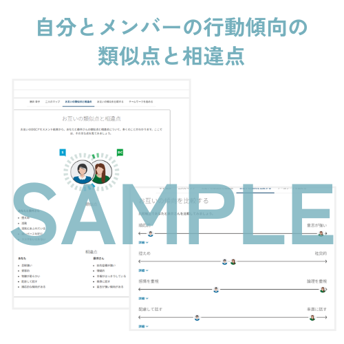 自分とメンバーとの行動傾向の類似点や相違点を、プラットフォーム上ですぐに見ることができます。一緒に働く上で重要な8つの比較尺度を、それぞれの項目ごとに視覚的に見比べながら、行動特性に基づくアドバイスも得られます