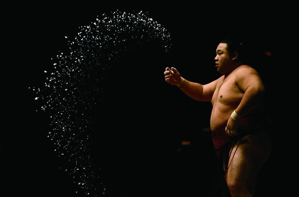 2005年10月7日にネバダ州ラスベガスで開催された大相撲の試合開始時、土俵に塩を撒く千代大海関。 (写真/Donald Miralle/Getty Images)