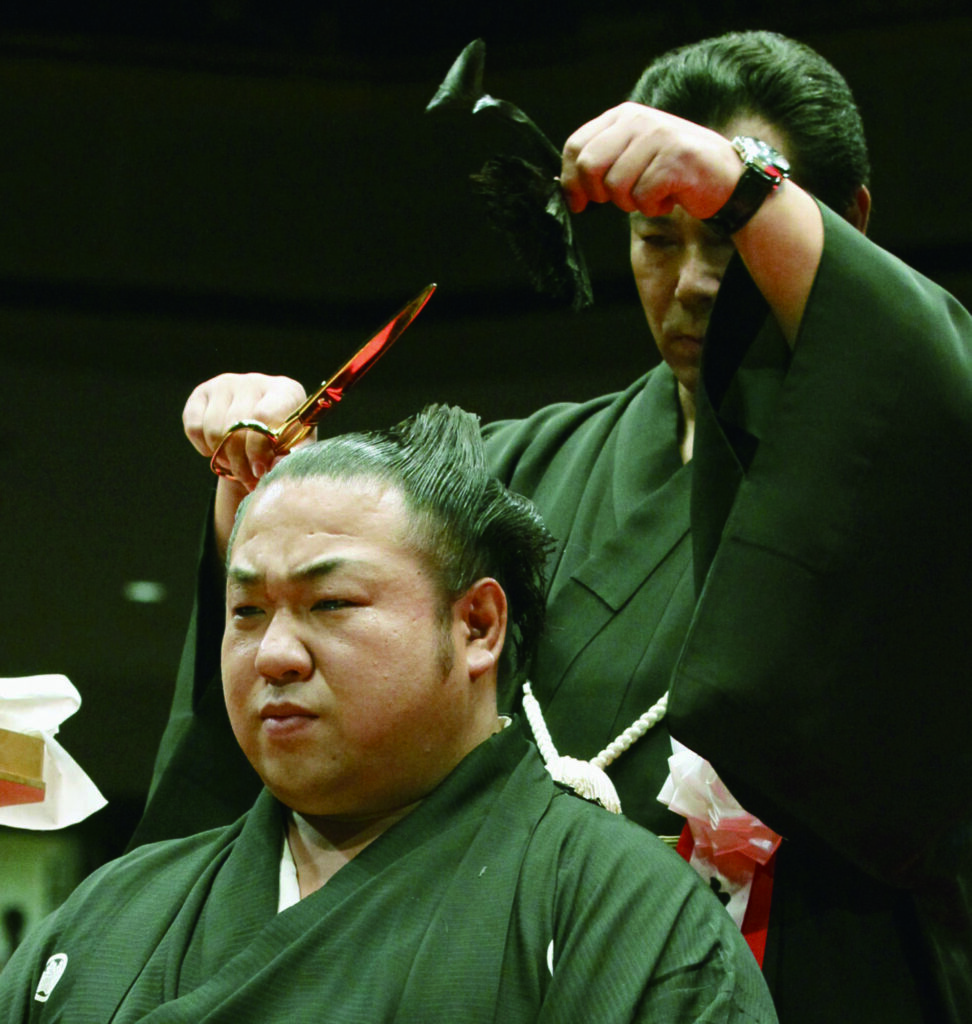 2010年10月2日、引退を表明し、師匠の九重親方に大銀杏を切ってもらう元大関千代大海。(写真/共同通信)